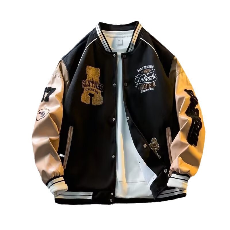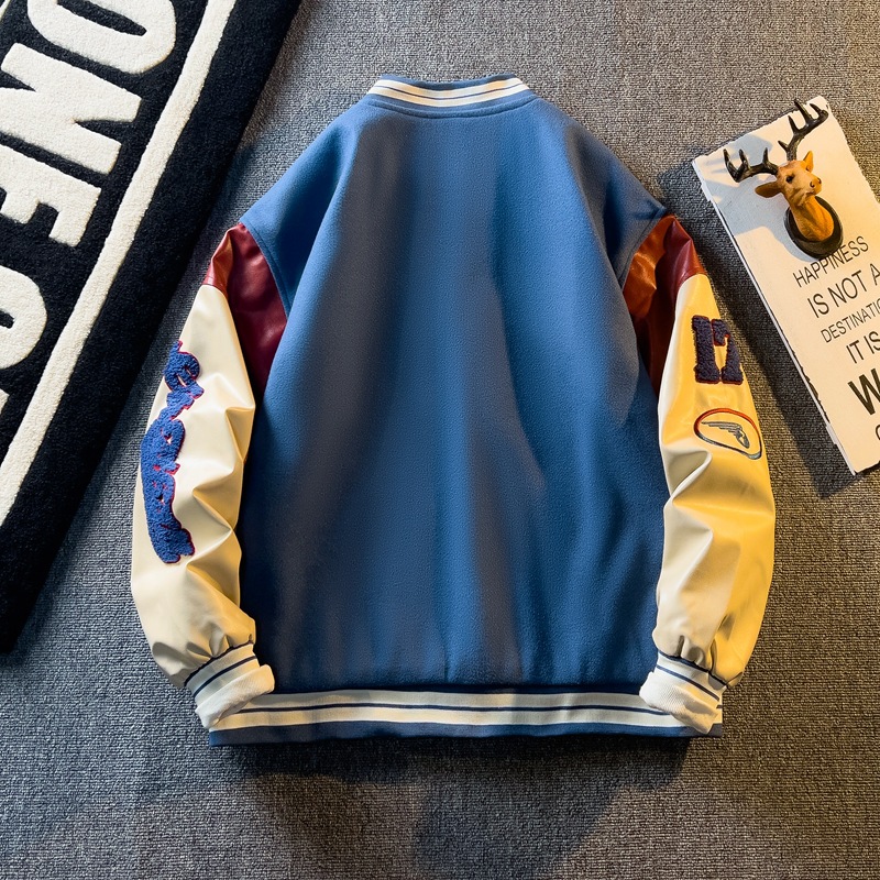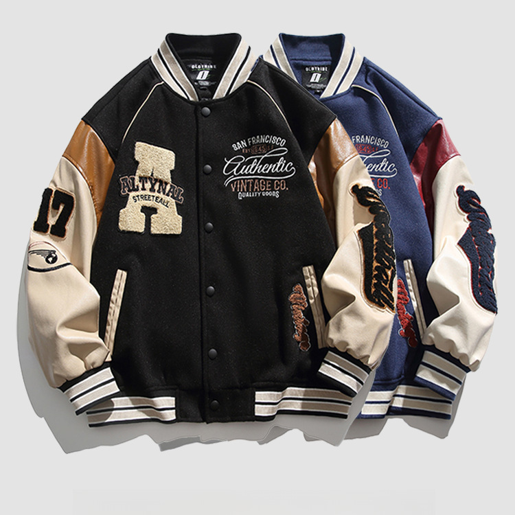身頃と袖の配色切り替えデザインが特徴的で、胸元や袖には立体的な刺繍ワッペンが施されています。
