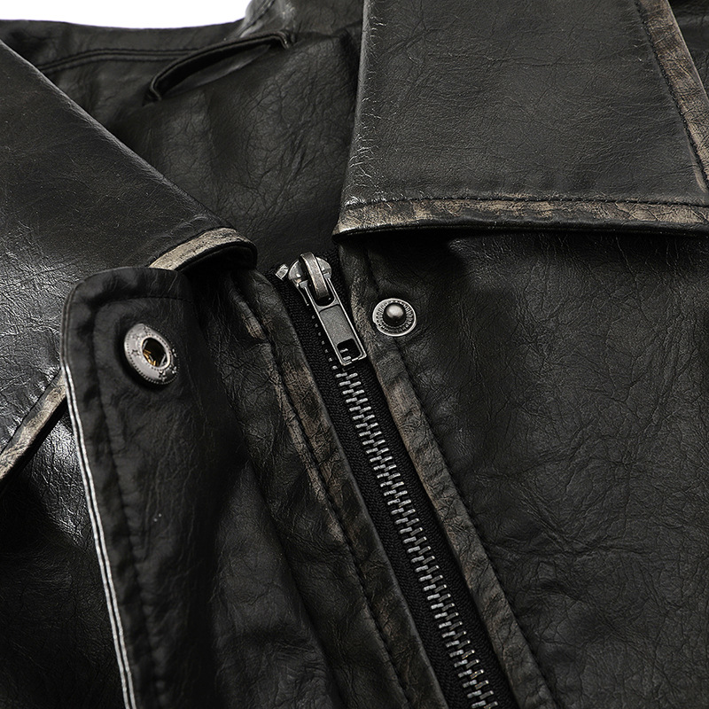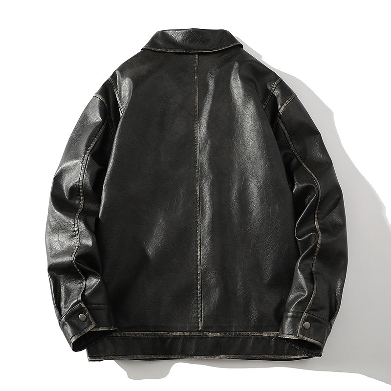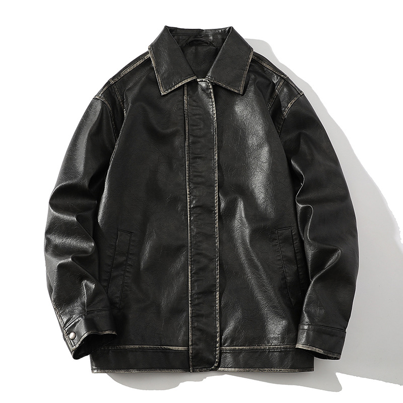 アメカジスタイルの定番として長年愛される、本革調の上質な素材を使用したジャケットです。 襟付きのクラシックなデザインに、ヴィンテージ加工を施すことで味わい深い風合いを実現しました。 フロントはスナップボタン仕様で、両サイドには実用的なポケットを配置しています。 ゆったりとしたシルエットで着心地も抜群、幅広いコーディネートに対応できる万能な一着です。