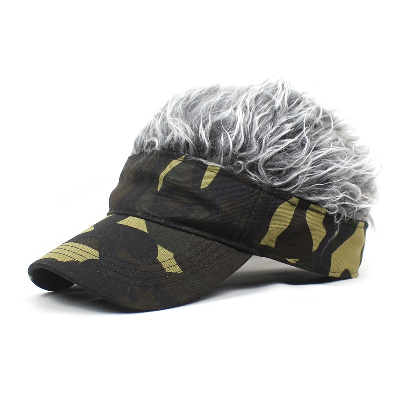 個性的なヘアー付きデザインが目を引くユニークなキャップです。 サンバイザータイプで頭頂部が開いており、付属のフェイクヘアーが髪の毛のように見える遊び心満載のアイテムになっています。 迷彩柄のベース生地がアメカジスタイルにぴったりマッチし、アウトドアやフェスなどのイベントで注目を集めること間違いなしです。 パーティーやイベントでの話題作りにも最適な一品です。
