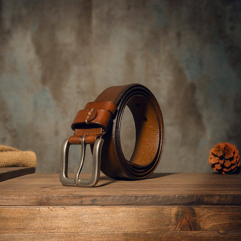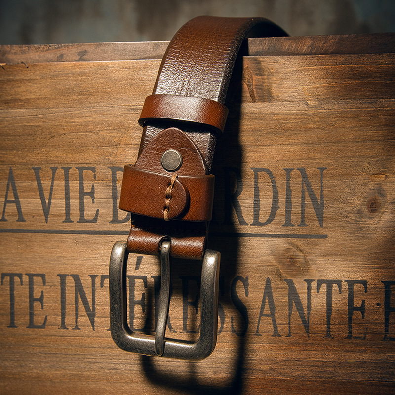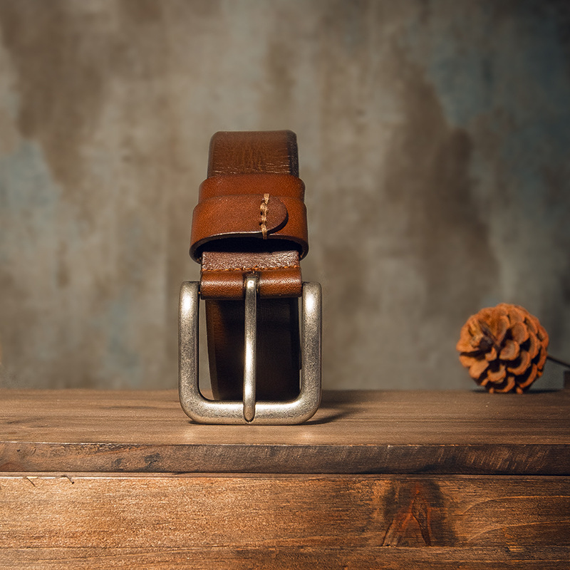 使い込むほどに風合いが増す天然皮革の質感と、真鍮製のピンバックルが織りなすヴィンテージ感が魅力的です。