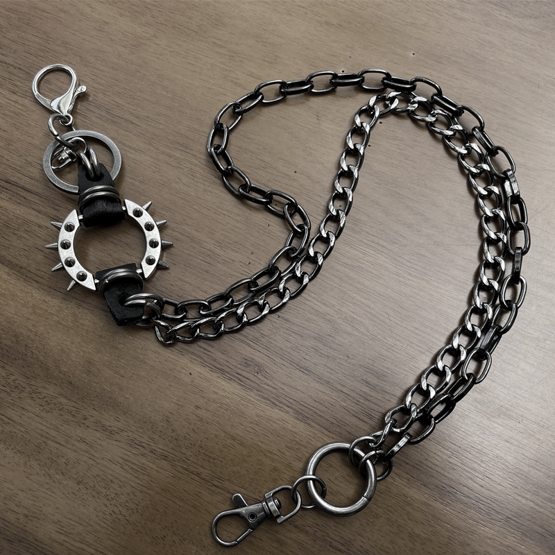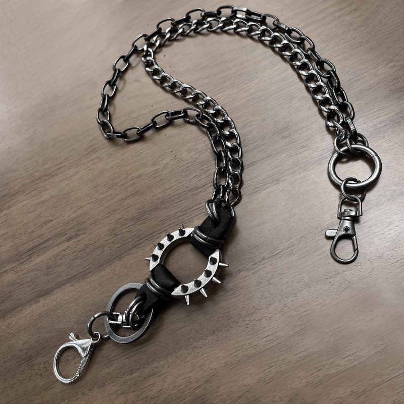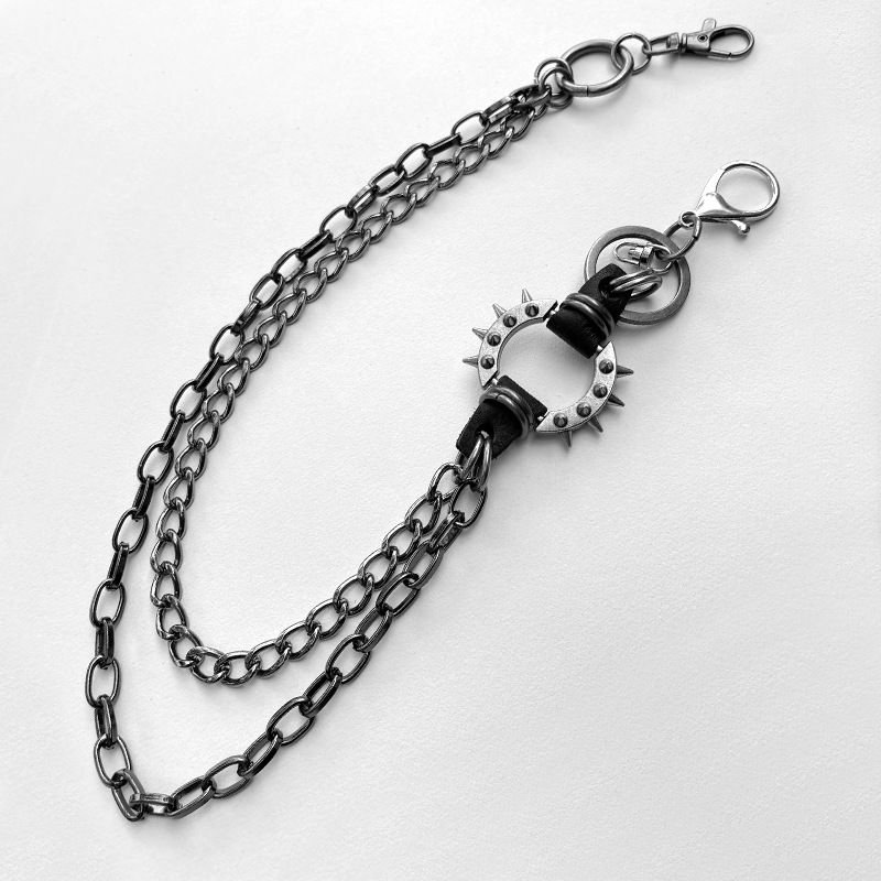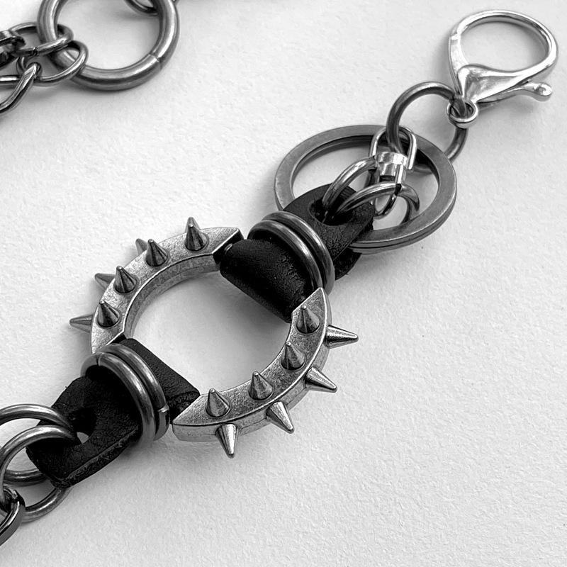 二連の鎖が織りなす立体的なデザインに、スタッズが施された円形リングと革紐の組み合わせがアクセントとなり、無骨ながらも洗練された印象を演出します。