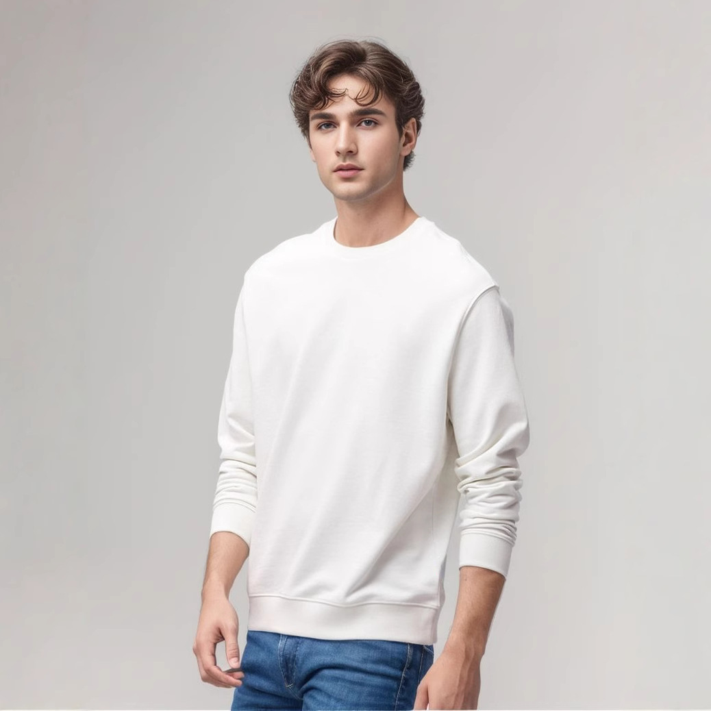 裾と袖口のリブ編みがすっきりとしたシルエットを演出し、カジュアルながら洗練された印象を与えます。