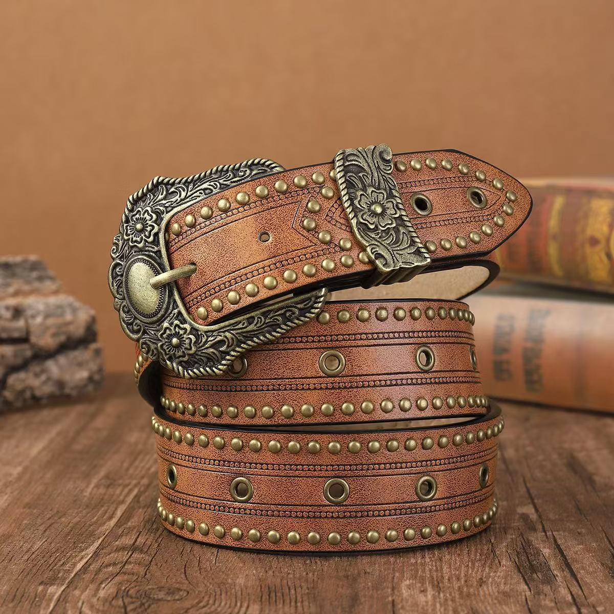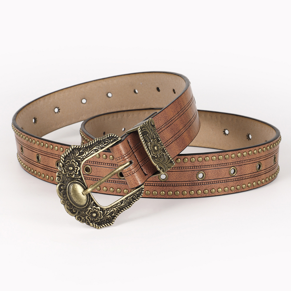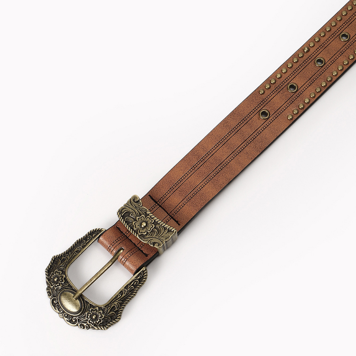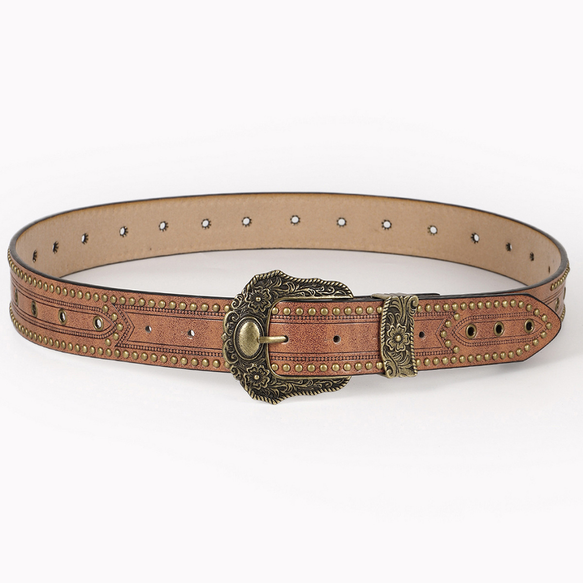 ベルト全体に配された金属鋲とアイレットが立体感を演出し、カジュアルながらも存在感のある仕上がりです。