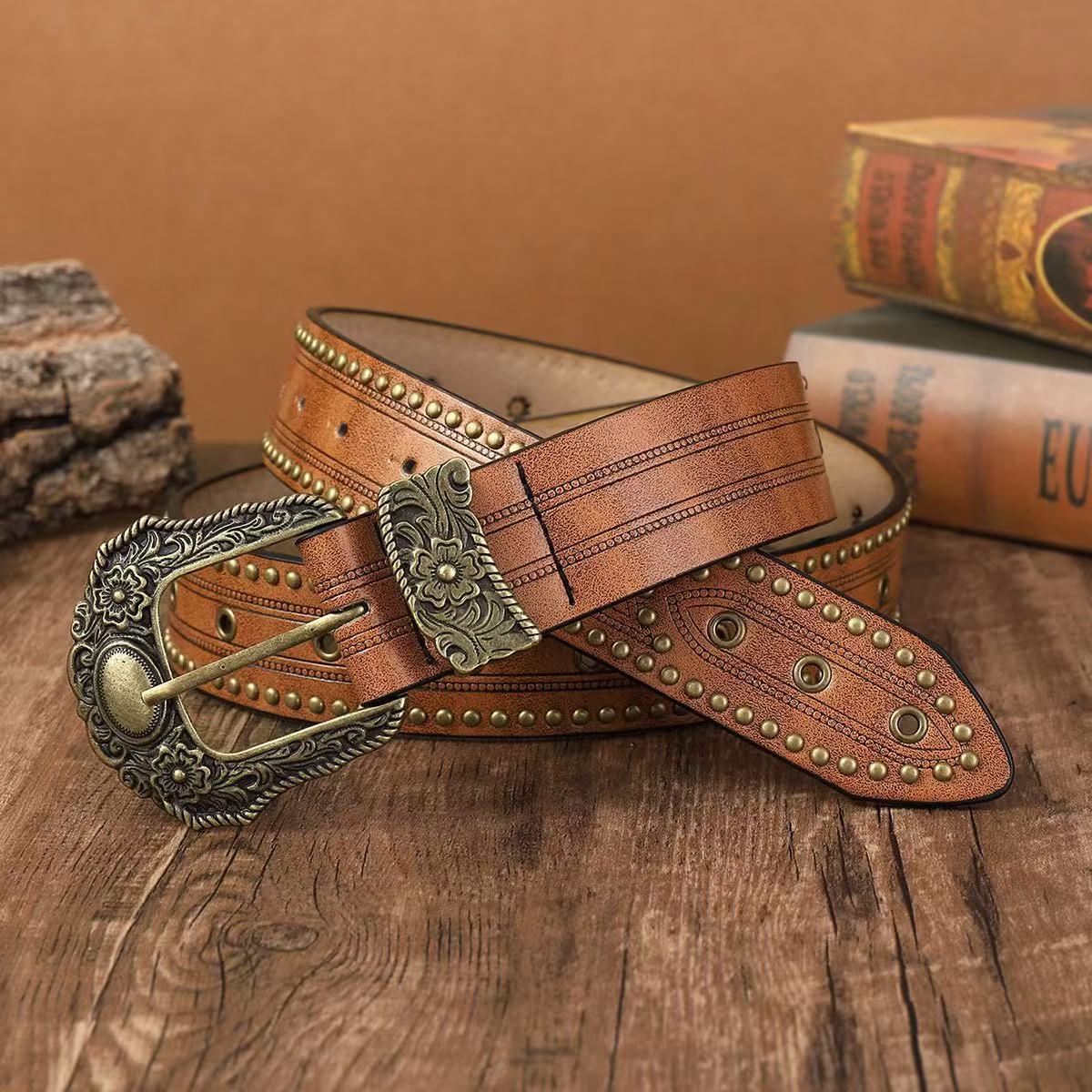 西部開拓時代を彷彿とさせる重厚な唐草模様のバックルが印象的なベルトです。