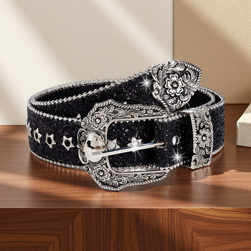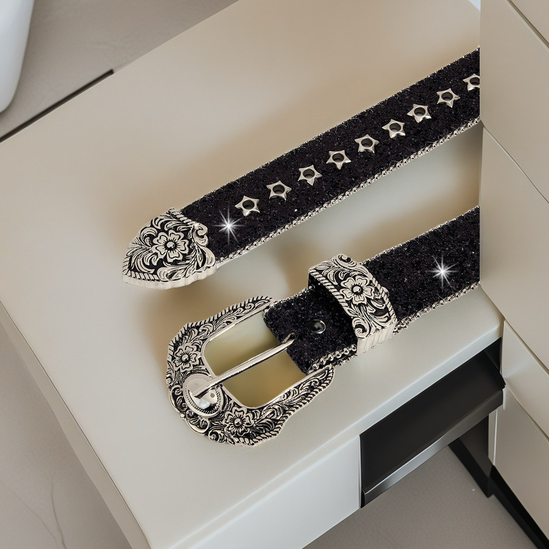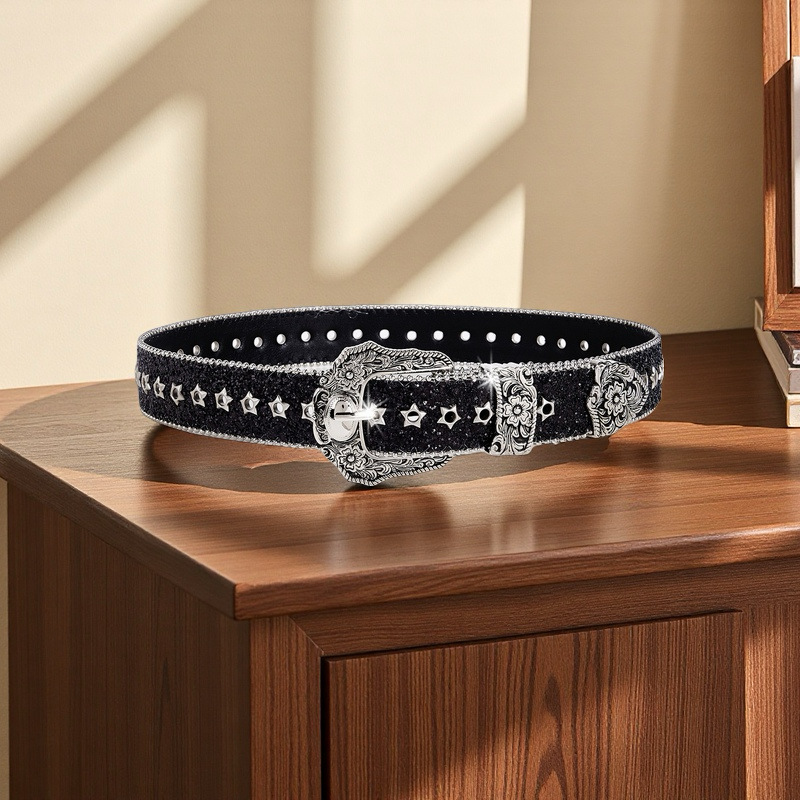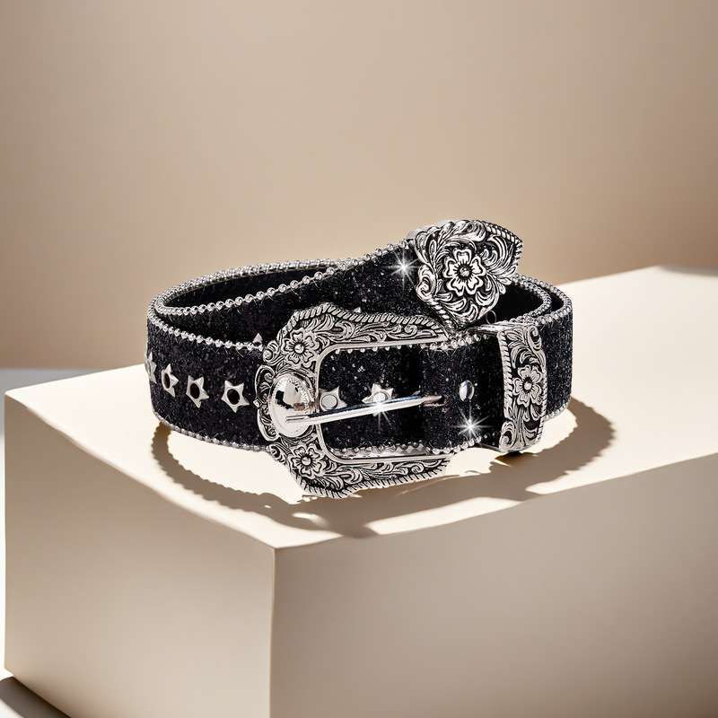 きらびやかなラメ素材とスタッズ装飾が目を引く、存在感抜群のベルトです。